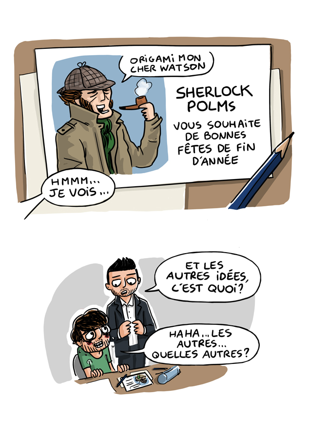 Une série de petits gags que j'ai fais il y a quelques temps pour la page Facebook de Polm Studio. Ceux en noir et blanc, c'est les propositions non-retenues.