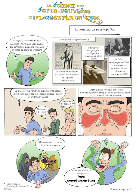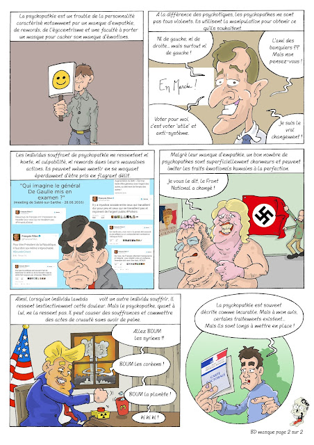 Aujourd'hui, on va parler de toutes sortes de masques, au sens premier du terme déjà, mais aussi en matière de maladie de peau ou encore en ce qui concerne la faculté de certaines personnes - les psychopathes - à cacher leur réelle personnalité..., ça nous donnera d'ailleurs l'occasion de parler un peu de politique, ça faisait longtemps.