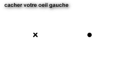 Cliquer sur l'image pour l'agrandir (ça marche aussi avec ce format mais cela vous obligera à vous approchez plus de votre écran). Fermez votre œil gauche et fixez bien la croix, et uniquement la croix, approchez-vous à environ 30 cm de votre ordinateur, vous ne verrez plus le rond.