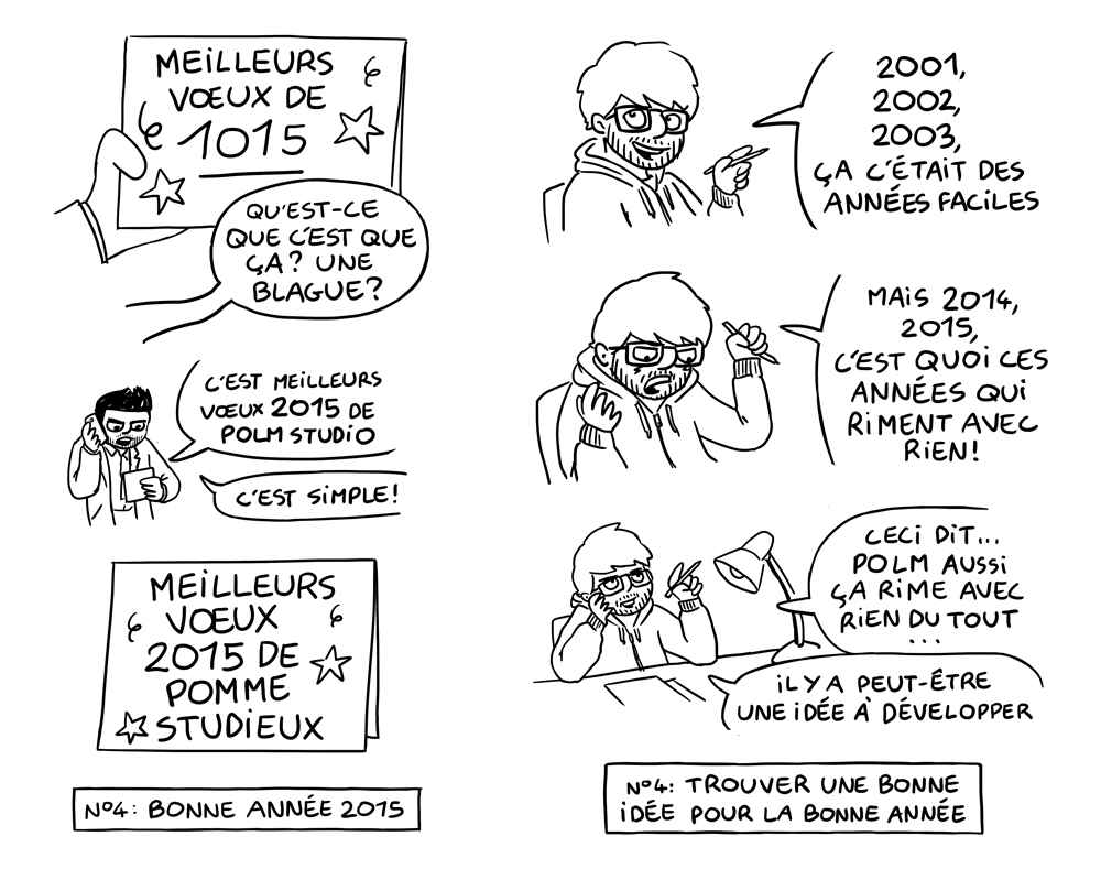 Une série de petits gags que j'ai fais il y a quelques temps pour la page Facebook de Polm Studio. Ceux en noir et blanc, c'est les propositions non-retenues.